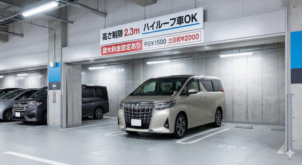 ミニバンやSUVなど全高が高い車(ハイルーフ車)の場合、駐車場の選択肢が激減します。当日現地で車高オーバーと言われてから探すと、空いている場所は往々にして最大料金がない高額な平置き駐車場だけ、なんてことになりかねません。