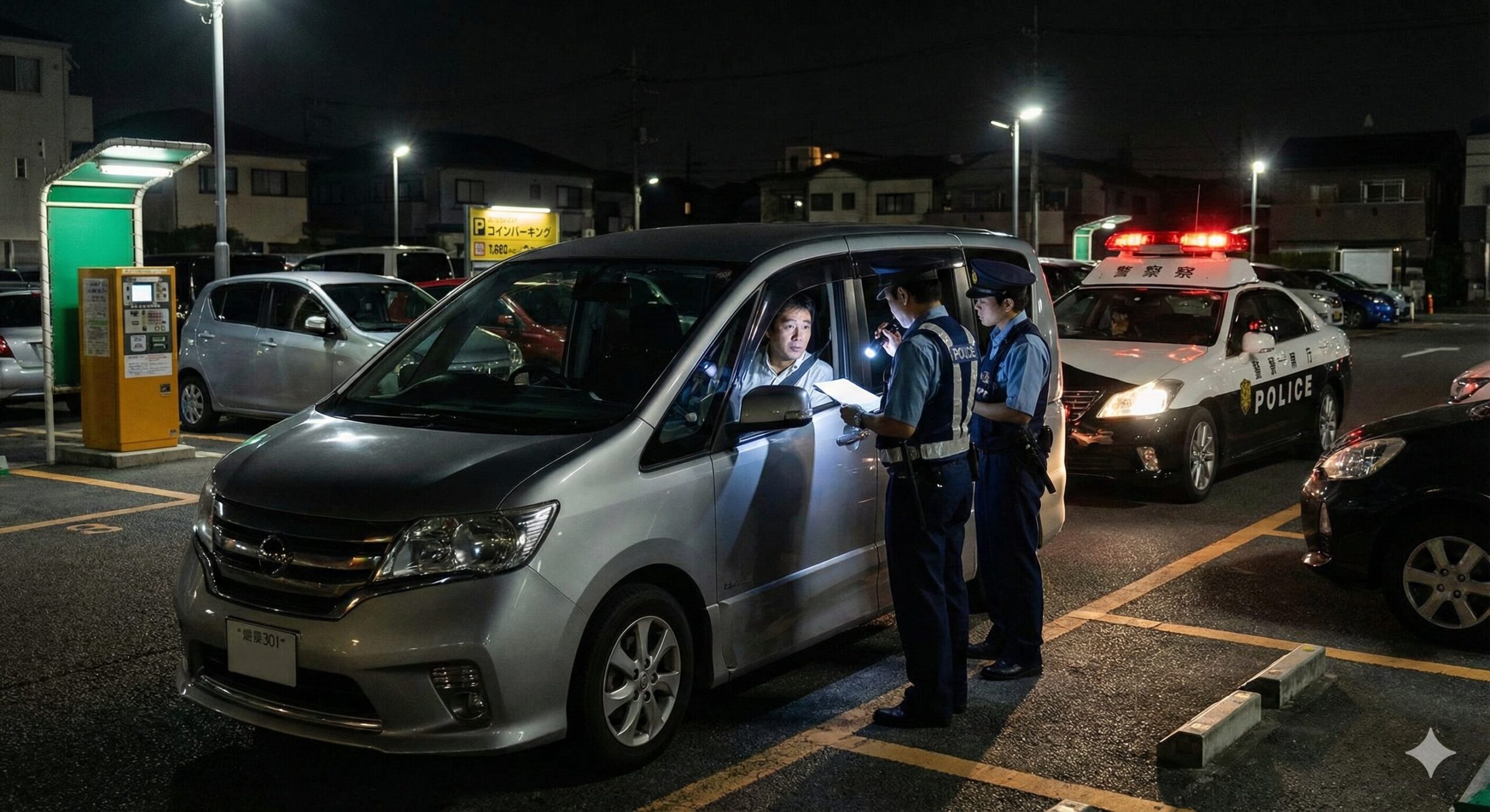 ただし、法律違反ではないからといって、警察と無縁でいられるわけではありません。むしろ、警察官による職務質問のリスクはかなり高いと考えておいたほうがいいでしょう。夜間の駐車場で、窓にサンシェードを貼り巡らせ、エンジンを切って(あるいはアイドリング状態で)じっとしている車は、パトロール中の警察官からすれば「不審車両」そのものです。事件の容疑者が潜伏しているのではないか、あるいは車内で自殺を図っているのではないかといった懸念を持たれるため、深夜に窓をコンコンと叩かれるケースが後を絶ちません。