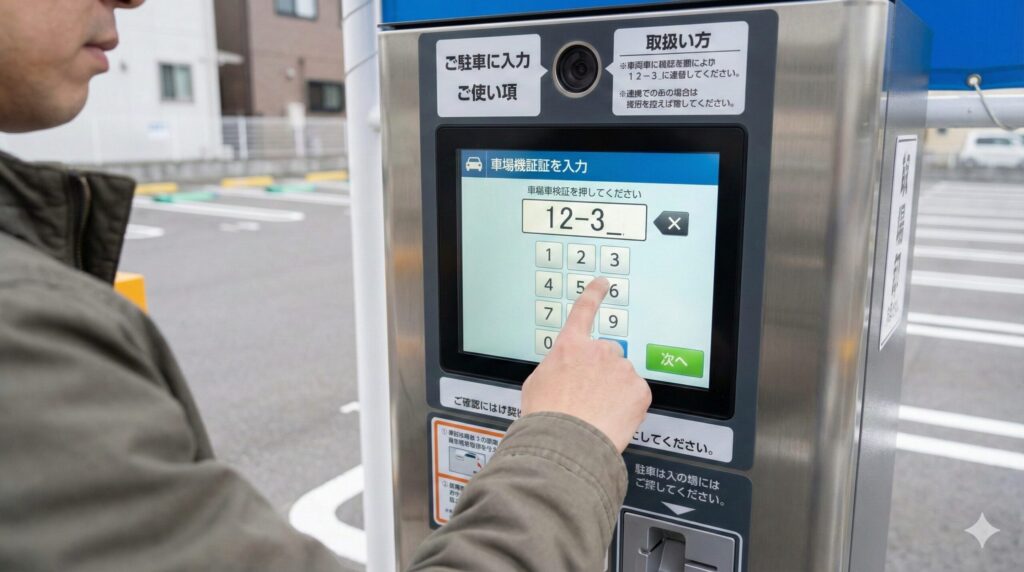 カメラ式の場合、精算機で最初に入力するのは「車室番号」ではなく、自分の車の「車両ナンバー4桁」です。レンタカーやカーシェアを利用している際や、新車に乗り換えたばかりの時は、意外と自分のナンバーを覚えていないものです。「えーっと、12-34だったかな?」と適当に入力すると、全く別の場所で停まっている他人の車が表示されてしまうことも。スマホで自分の車のナンバーを写真に撮っておくか、メモアプリに控えておくとスムーズですよ。