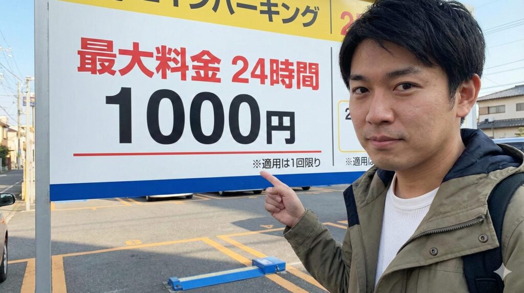 看板にデカデカと「24時間最大1,000円」と書かれていても、その下に小さな文字で「※最大料金の適用は1回(24時間)のみ」と記載されていることがあります。これを知らずに2日間(48時間)停めた場合、最初の24時間は1,000円ですが、後半の24時間は通常料金(例:20分200円など)が加算され、合計で1万円を超える請求が来る……なんてことも珍しくありません。長期で利用する場合は、「繰り返し適用」という文言があるかどうかを必ず確認してください。