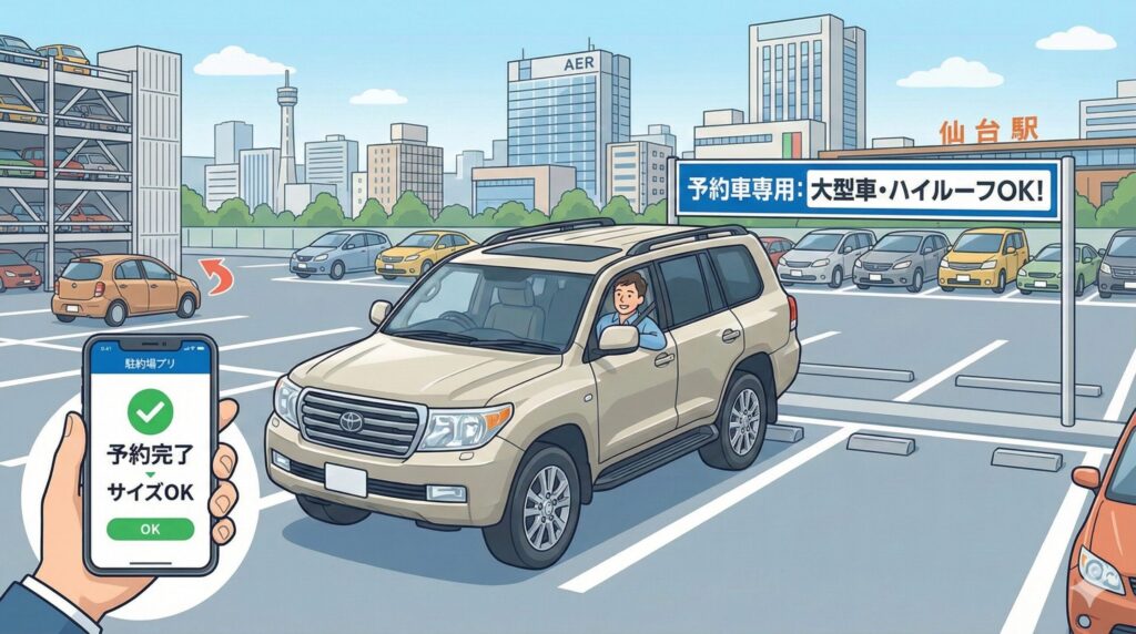 アルファードやランドクルーザーといった大型車、あるいはルーフキャリアを積んだハイルーフ車に乗っている方にとって、仙台駅前の立体駐車場は「天敵」です。多くの立体駐車場が高さ1.55m、高くても2.1mという制限があり、せっかく空きを見つけても入庫できない……なんて悲劇がよく起こります。せっかくの家族旅行で車を停められず、パパだけが遠くの駐車場を探しに行く、なんて寂しい思いはしたくないですよね。