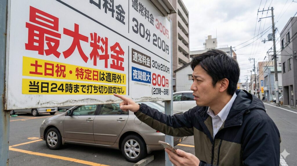 仙台のコインパーキングを利用する上で、最も注意しなければならないのが「最大料金の適用条件」です。看板にデカデカと「最大料金800円」と書いてあっても、その横に「※土日祝を除く」や「※月〜金当日24時まで」といった小さな注意書きがあることが非常に多いんです。これが、いわゆる「最大料金(打ち切り)の罠」ですね。特に仙台駅前の一等地に多いパターンなので、慣れていないと見落としがちです。