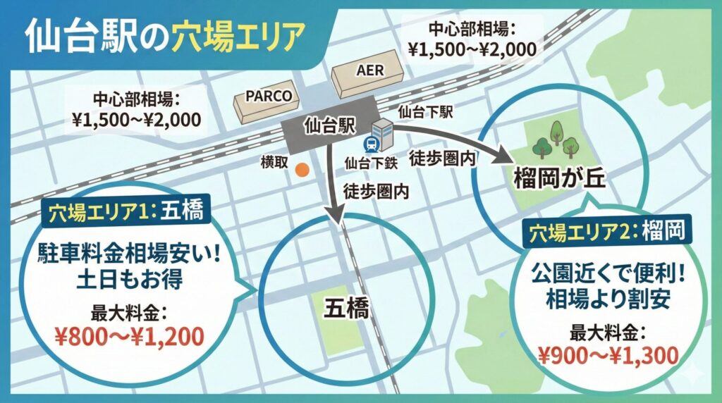 「駅から徒歩10分〜15分歩くのは苦じゃない」という方に、私がこっそり教えている穴場エリアが「五橋(いつつばし)」と「榴岡(つつじがおか)」です。仙台駅は地下鉄やJRが集中しているため駅前は高いですが、一駅分、あるいは数百メートル歩くだけで駐車料金の相場がガラッと変わるんですよ。この「歩く勇気」が節約の鍵になります。
