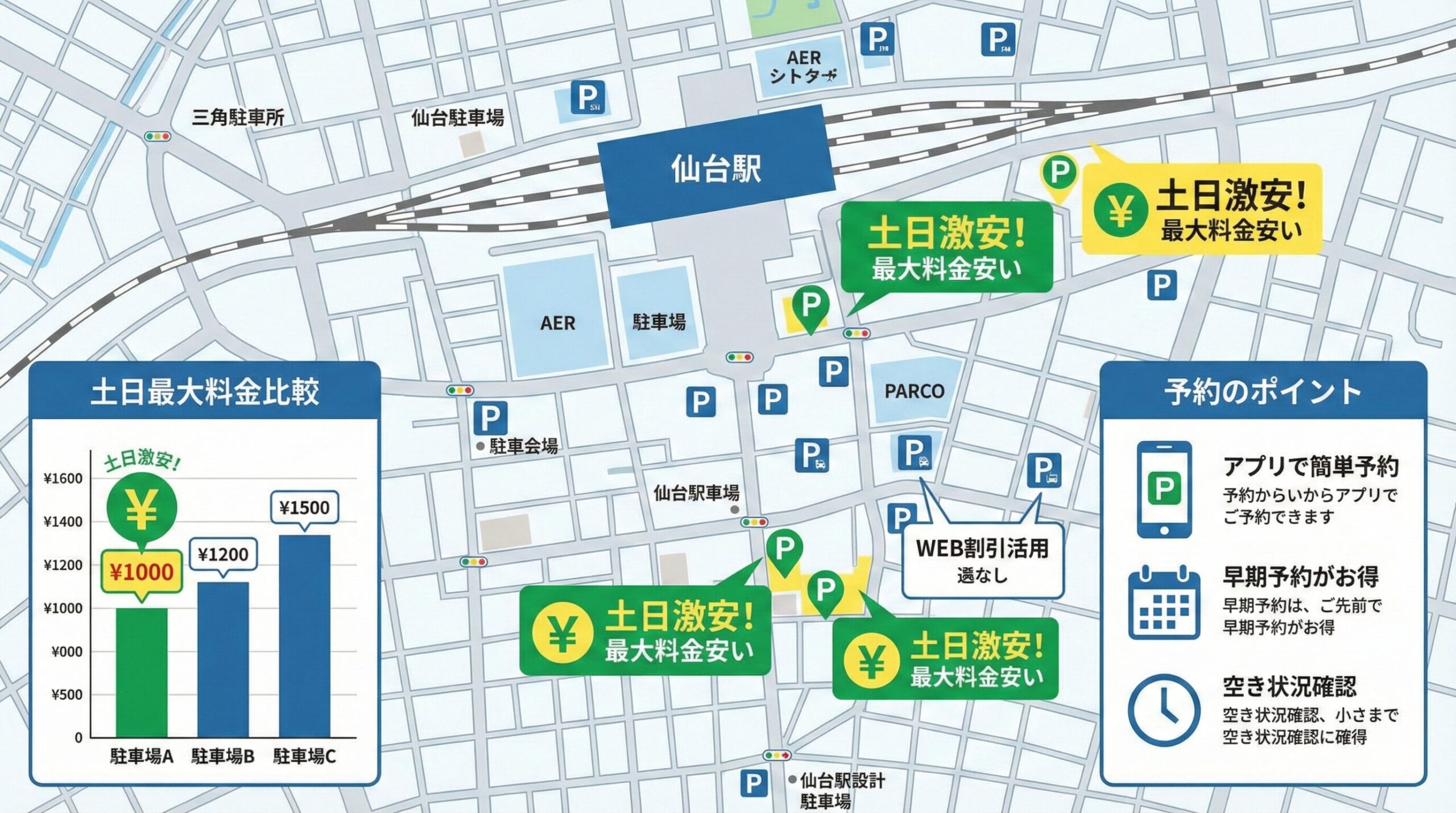 | 仙台駅東口周辺 | 1,100円〜1,400円 | コスパ重視・長時間駐車 |