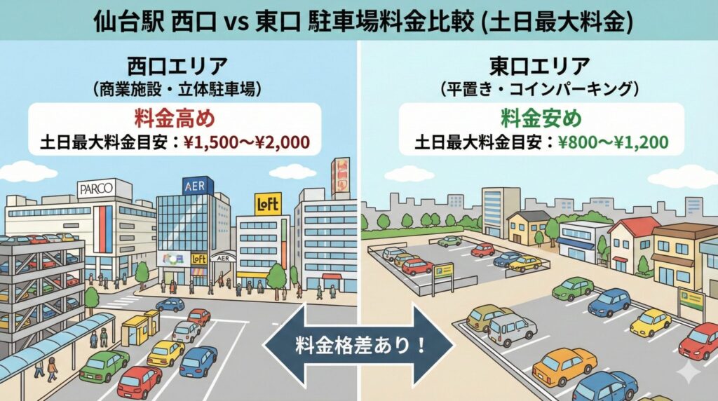 仙台駅周辺で長時間車を停める際、まず頭に入れておきたいのが「西口」と「東口」の料金格差ですね。西口側はロフトやパルコ、エスパル仙台といった大型商業施設が密集しており、利便性は抜群ですが、その分駐車料金も強気の設定です。1時間あたりの単価が600円〜800円に達することも珍しくありません。一方、東口側は比較的平置きの駐車場が多く、西口に比べると最大料金の相場が200円〜400円ほど安くなる傾向があります。
