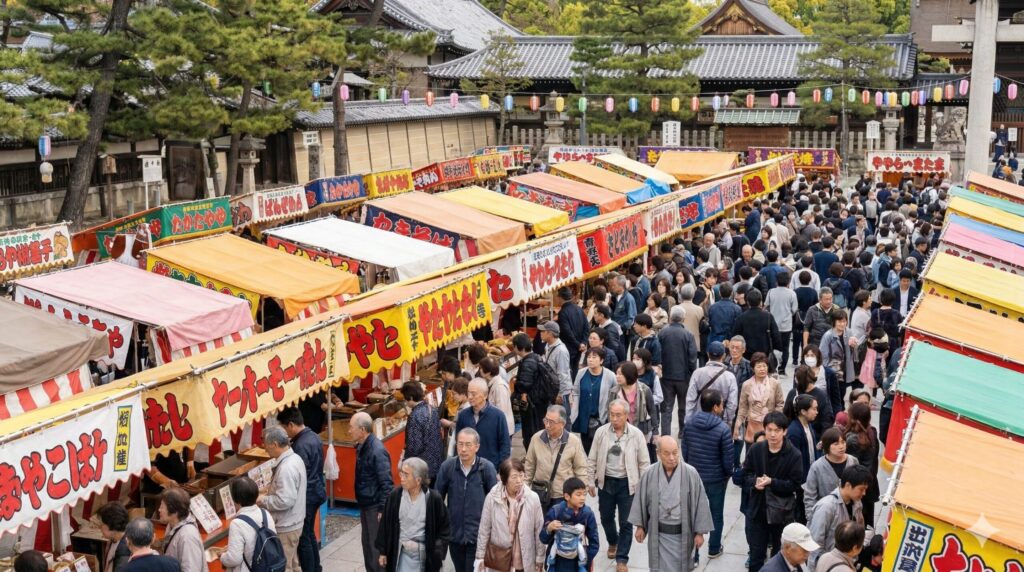 毎月25日は、北野天満宮で最も賑わう「天神さん」の縁日です。この日は境内一帯に多数の露店が立ち並び(例年数百店規模)、多くの参拝客でごった返します。非常に楽しいイベントですが、車で行く方には大きな落とし穴があります。例年、25日は公式駐車場が利用できないことが多いため、事前確認は必須です。これは駐車場スペース自体が露店の設営や資材置き場として使われるためで、一般車両は入り口で断られてしまいます。