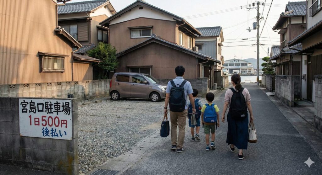 特におすすめなのが、一駅隣のJR阿品駅前や広電阿品駅周辺です(広島県公式サイトより)。阿品駅周辺の駐車場は、24時間最大料金が300円〜400円前後に設定されている駐車場もあり、宮島口駅前の3分の1以下の価格設定。ここに車を停めてJRに乗れば、わずか2分で宮島口駅に到着します。「駐車場の空き待ちで1時間浪費する」ことを考えれば、電車代を払ってもお釣りが来るほど価値がある選択だと思いませんか?