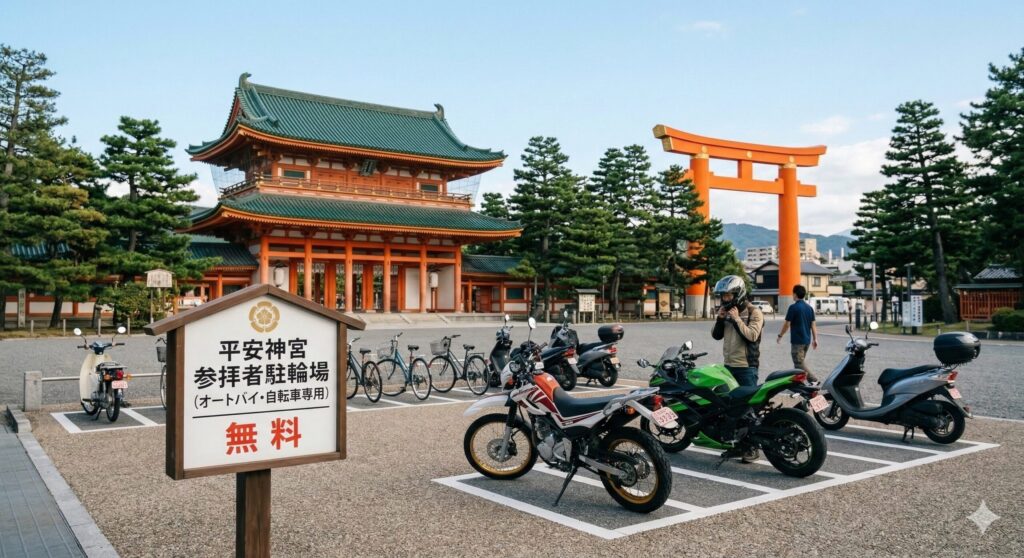 車での無料駐車は非常に限定的ですが、バイクや自転車であれば公式に提供されている無料駐輪場を活用することができます。最もアクセスが良いのは、平安神宮の正面にある「応天門」に向かって右側(東側)の、古札納所付近に設置された参拝者専用の駐輪スペースです。ここは自転車だけでなく、原付や自動二輪車も無料で停めることができ、参拝の間だけ利用するのであれば非常に便利なスポットとなっています。