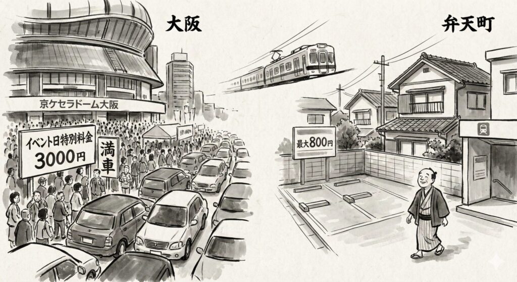 弁天町エリアの駐車場事情を語る上で避けて通れないのが、隣接する京セラドーム大阪の存在です。ドームでコンサートやプロ野球の試合がある日は、ドーム周辺の駐車場が2,500円〜3,000円を超える水準になることもあるような「特定日料金」に切り替わり、しかもどこも満車という地獄絵図のような状況になります。そんな時、あえて1駅離れた弁天町を拠点にする戦略が非常に有効です。
