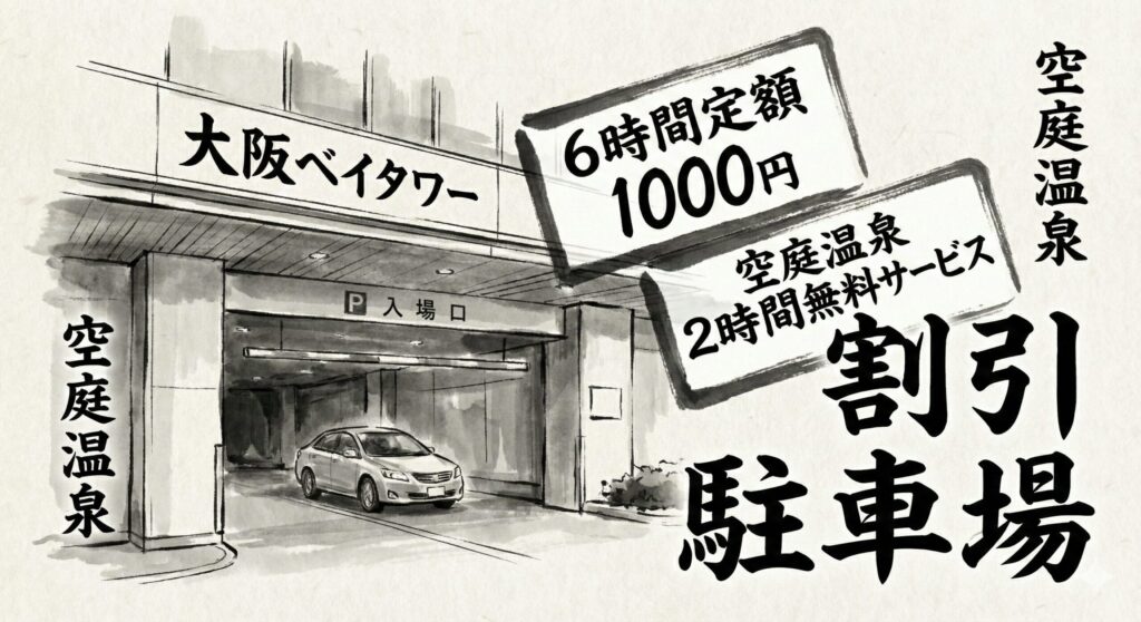 弁天町を訪れる目的が「空庭温泉」や「大阪ベイタワー」でのレジャーなら、施設直結の巨大な「パラカ大阪ベイタワー駐車場」を割引込みで利用するのが最も効率的です。1,100台という地域最大級のキャパシティがあるため、他の小規模なコインパーキングが満車でもここなら停められる、という「最後の砦」のような存在でもあります。料金設定については、時期や曜日によって多少前後しますが、入庫から最初の6時間が定額料金となる日が多く、目安として1,000円前後で利用できるケースがあります。