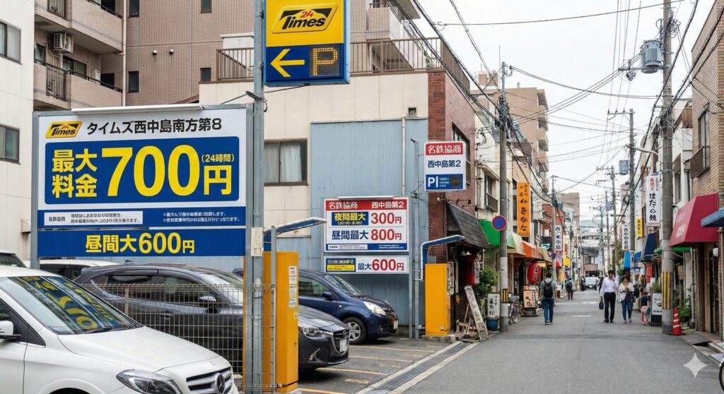 特におすすめしたいのが、新御堂筋から一本西に入った住宅街エリアです。この辺りは一方通行が多いものの、「タイムズ西中島7丁目第2」などのように、リーズナブルな設定を維持している駐車場が見つかりやすいです。また、このエリアの面白さは「夜間一律料金」にもあります。20時以降の入庫で翌朝まで300円〜500円といった設定もあり、夜の新幹線で戻ってきて、そのまま車で帰宅するようなスケジュールなら、さらにコストを抑えることが可能です。
