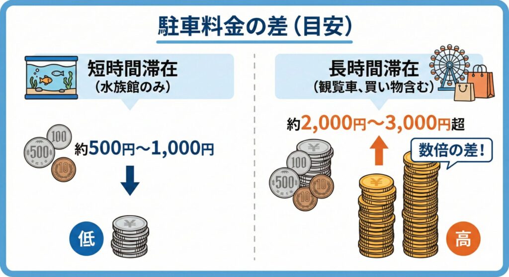 これは、エリア全体の収益構造が観光客の滞在時間に基づいているためと考えられますが、利用者にとっては「滞在すればするほどコストがかさむ」という現実を突きつけられます。食事をして、水族館を見て、観覧車に乗る……といったフルコースを楽しむと、滞在時間は4〜5時間を容易に超えてしまいます。この場合、時間課金で支払うと公式駐車場ではかなりの高額になるため、やはり最大料金が設定されている周辺のコインパーキングを探す価値が非常に高まってくるんです。特に、家族全員でゆっくり買い物を楽しむようなプランなら、駐車料金が固定される場所を選ぶだけで、心にゆとりが生まれますよね。割引がないことを逆手に取り、最初から「安くて定額」の場所を選ぶのが賢い選択かなと思います。