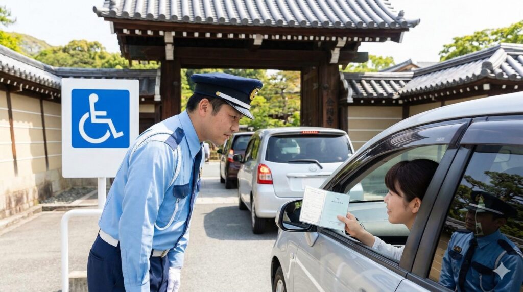 利用方法は簡単です。駐車場の入り口で係員の方に手帳を提示し、車椅子を利用する旨などを伝えてください。なるべく参道に近く、乗り降りがしやすい広いスペースへ優先的に案内してもらえることもあります。金閣寺の境内は砂利道が多いのですが、舎利殿の近くまでは車椅子でも移動しやすいように整備されたルートが用意されています。移動に時間がかかる場合でも、最初の1時間が無料になるだけで、心理的な余裕が全く違いますよね。また、京都市が推進する「京都おもいやり駐車場利用証制度」の対象スペースも確保されており、誰もが安心して世界遺産を楽しめる環境が整っています。