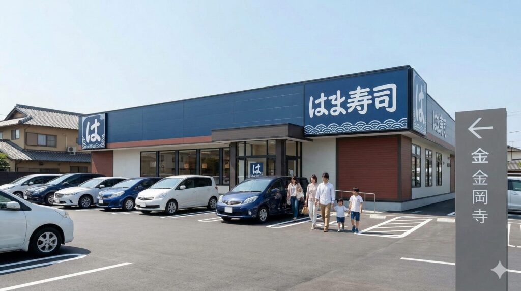 「家族連れだから車は必須。でも、金閣寺の参拝時間分くらいの駐車料金は浮かせたいな」という方に、ぜひチェックしてほしいのが「はま寿司 金閣寺店」の駐車場を活用するルートです。金閣寺から徒歩で約5分という絶好のロケーションにあり、周辺のコインパーキングが満車の際にも心強い存在になります。
