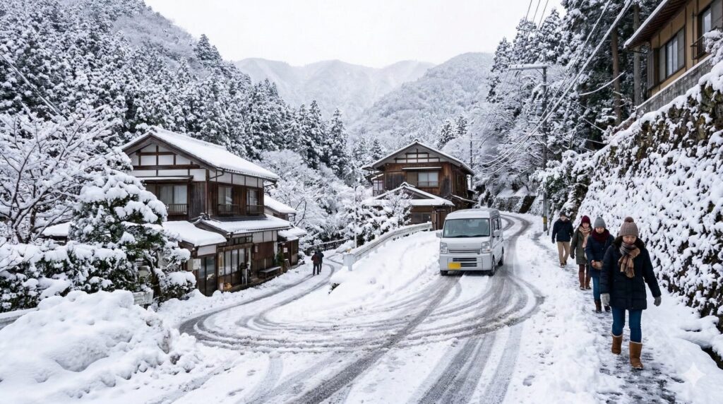 京都市内中心部が雨の日でも、北部の鞍馬は真っ白な雪景色になっていることがよくあります。このエリアは標高が高く、冬は積雪や路面凍結が発生することがあります。特に京都府道38号(鞍馬街道)は道幅が狭く、一度スリップ事故や立ち往生が発生すると、道路全体が完全に閉鎖されてしまうリスクがあります。自分自身だけでなく、他の参拝者や地元の方々の安全を守るためにも、冬のドライブには特別な準備が必要です。