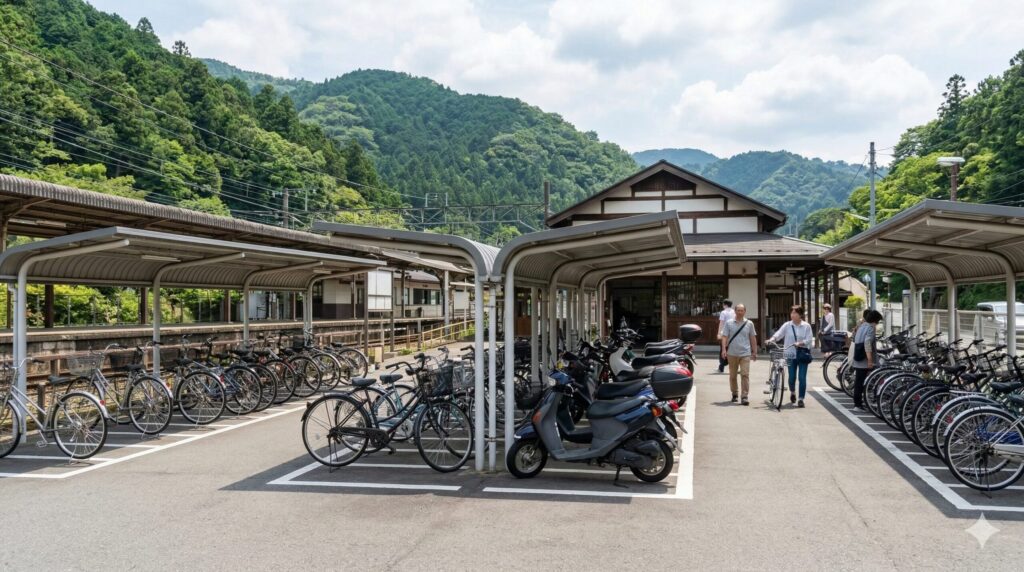自転車での訪問も同様に、山門前には無料の公式駐輪場は期待できません。さらに、鞍馬まではかなりの急坂が続くため、体力的な負荷も相当なものです。そこでおすすめなのが、麓の駅を活用する方法。具体的には、市原駅や二軒茶屋駅周辺の駐輪スペースに停めて、そこから電車に乗り換えて鞍馬駅へ向かうという選択肢です。これなら無理に険しい坂を登り切る必要もなく、スムーズに参拝へと移ることができます。バイクの方も、後述する予約サービスでバイク利用が許可されているスペースを探すのが、現地の駐輪場難民を避けるための最も確実な防衛策かなと思います。無理な路肩駐車は避け、現地のルールを守って楽しみましょう。