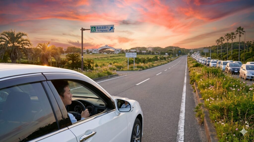 楽しい一日が終わった後、最後の大仕事が「帰りの渋滞」との戦いです。閉園間際になると、約5,000台の車が一斉に出口を目指すため、駐車場から出るだけで30分以上かかることもあります。さらに、多くのナビが推奨する国道42号線や白浜駅方面のルートは、信号待ちの影響で激しい渋滞が発生しがちです。