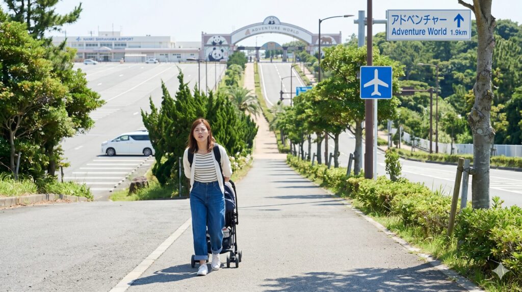 まず大前提として、ここは空港利用者向けの駐車場のため、長時間の目的外利用は推奨されません。レジャー目的で長時間占有することは、本来の空港利用者の妨げになる可能性があるため、マナーを守った判断が求められます。また、空港からアドベンチャーワールドの入り口までは距離にして約1.9kmあり、徒歩20〜30分程度(坂道あり)の時間を見ておく必要があります。白浜の夏は非常に暑く、坂道をこれだけの距離歩くのは想像以上にハードです。お子様連れや高齢者の方がいる場合は、移動だけで体力を使い果たしてしまうかもしれません。