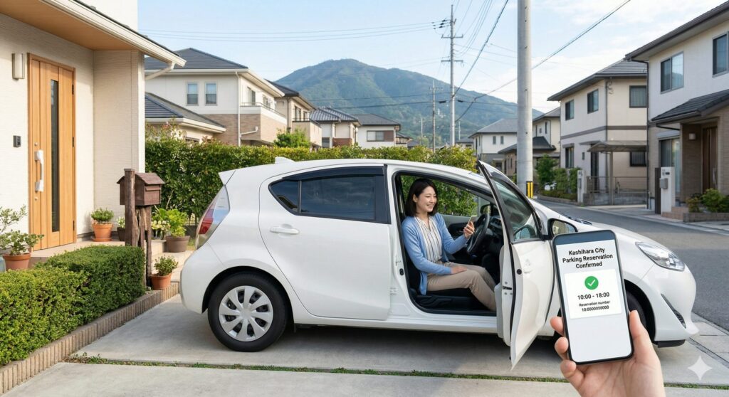 予約サイトの「特P(とくぴー)」は、最近非常に利用者が増えているサービスです。橿原神宮周辺でも多くのオーナーさんが登録しており、時期にもよりますが300円〜500円程度の比較的安価な物件が見つかることもあります。これは公式駐車場の料金とほぼ同等か、それ以下という設定です。最大のメリットは、20日前から事前に「自分専用の枠」を確保できること。無料で停められるかどうか分からない場所に賭けるより、数百円で安心を買っておく方が、当日の精神的な余裕が全く違います。スマホで決済まで終わるので、現地の精算機に並ぶ必要もありません。