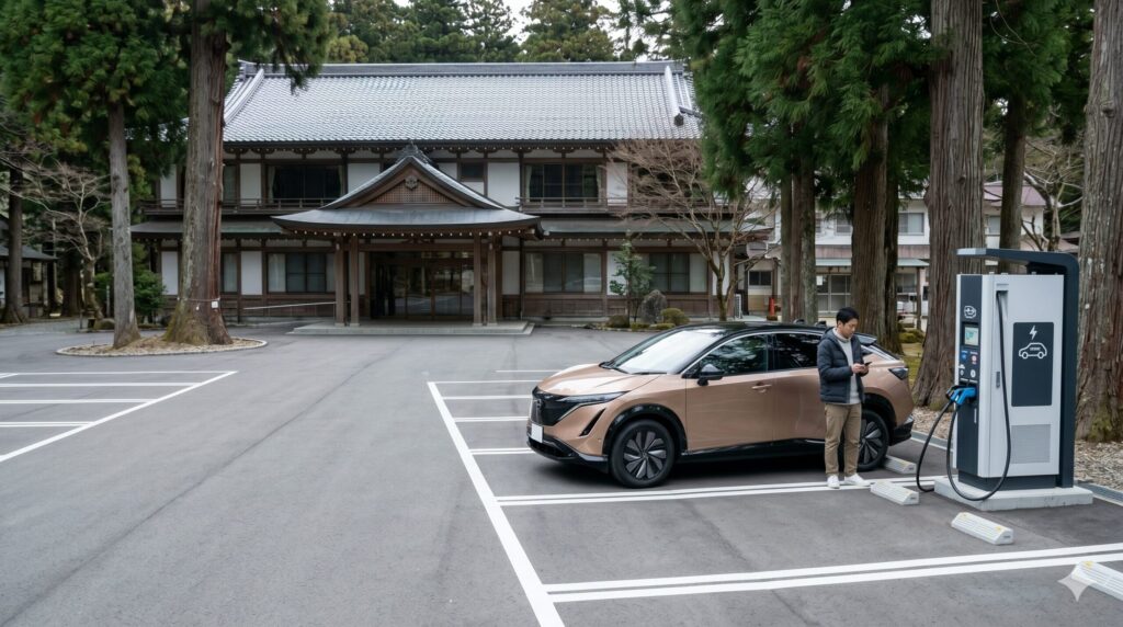 電気自動車(EV)で高野山を訪れる方は、バッテリー残量が気になりますよね。現時点で確認できる急速充電スポットの一つが「高野町役場」です。以前は玄関口近くにありましたが、現在は役場庁舎正面の駐車場内に設置されています。急速充電器が1基あり、24時間利用可能です。山を登りきった後の充電ポイントとして非常に重要ですね。