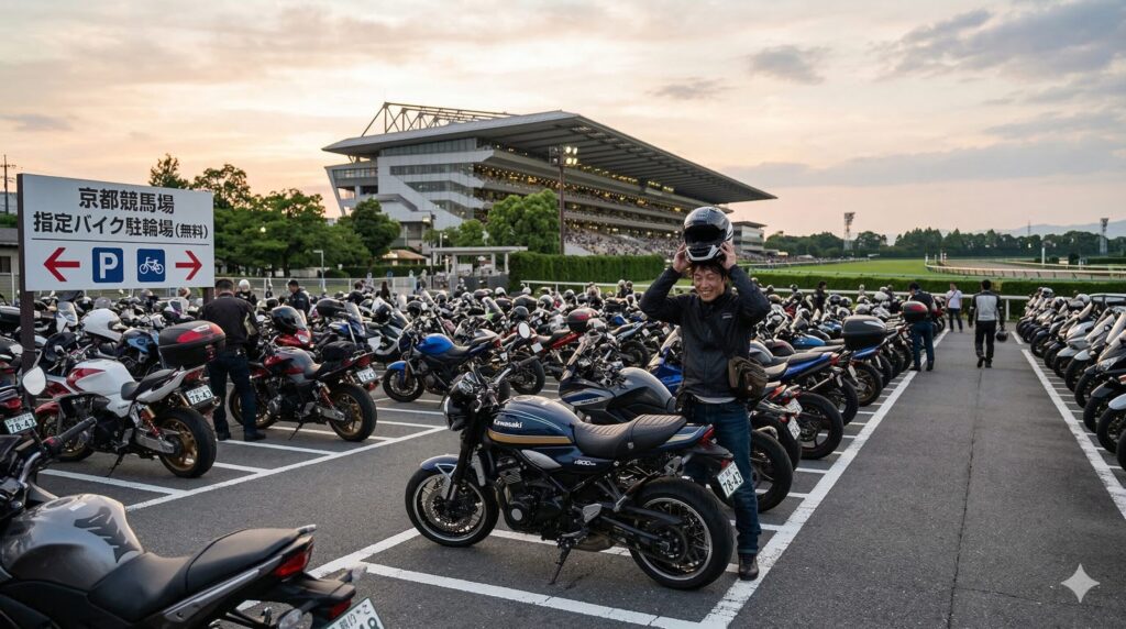 もしあなたが単独、あるいは二人での来場なら、バイクという選択肢は非常に強力です。京都競馬場では、自動車の駐車場不足を解消する一環もあり、バイクおよび自転車の駐輪場を無料で利用できる駐輪場が用意されています。これは経済的メリットが計り知れません。125cc以下の原付はもちろん、大型バイクであっても専用のスペースが用意されており、場内の誘導員さんが丁寧に場所を教えてくれます。