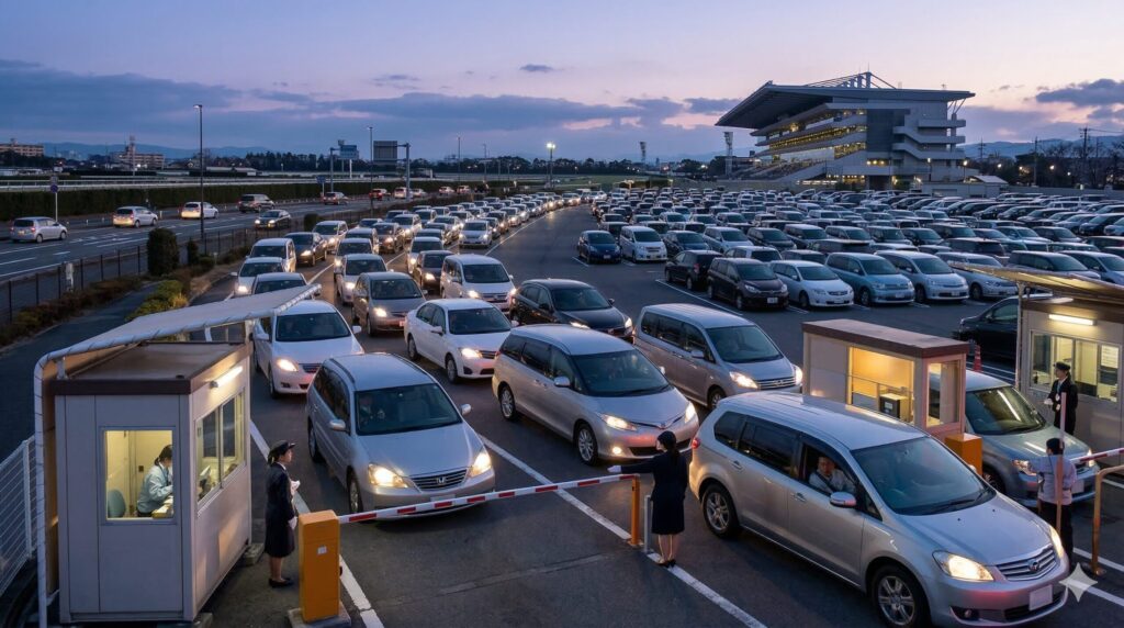 直営駐車場の開場時刻は、目安として8:00前後に開場することが多いですが、G1開催日などは早まることもあります。しかし、ここで注意が必要なのが「周辺道路での待機」についてです。特に注目度の高い重賞レースがある日は、開場時刻のかなり前から周辺道路に車両が集中し、早朝から大渋滞が発生することがあります。道路交通の安全を確保するために混雑状況により交通誘導が行われる場合がありますが、基本的には8時を一つの目安に動くのが定石です。