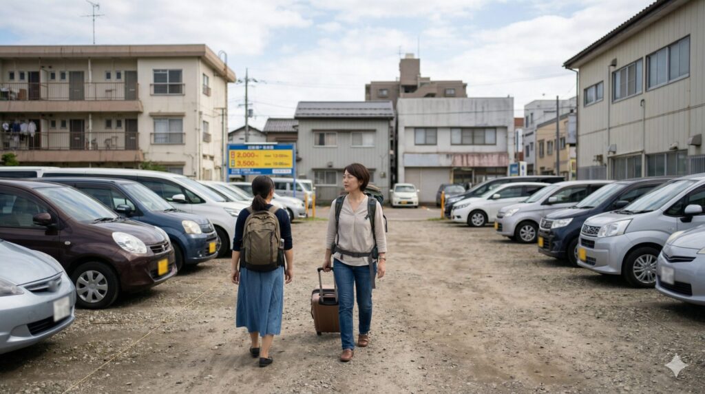 非常に便利な予約制駐車場ですが、あえて「注意点」も正直にお話ししておきますね。多くの予約スポットは、駅前の大通りではなく、一本裏に入った住宅街や少し入り組んだ路地にあります。そのため、初めて行くときは「え、ここ通れるの?」と少し不安になることもあるかもしれません。