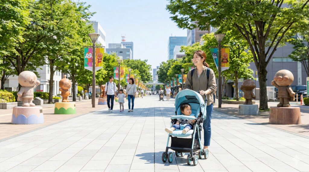 仙台駅周辺の駐車場を利用したり、あるいはJRで仙台駅に到着した場合、ミュージアムまでの「道のり」が気になるパパ・ママも多いですよね。重い荷物を抱えて、ベビーカーを押しながらの移動は大変。でも安心してください。仙台駅東口からミュージアムへと続く道は、再開発によって歩道が非常に広く、段差も最小限に設計されています。メインルートとなる「アンパンマンストリート」は、その名の通り子供たちが喜ぶ仕掛けがいっぱいです。